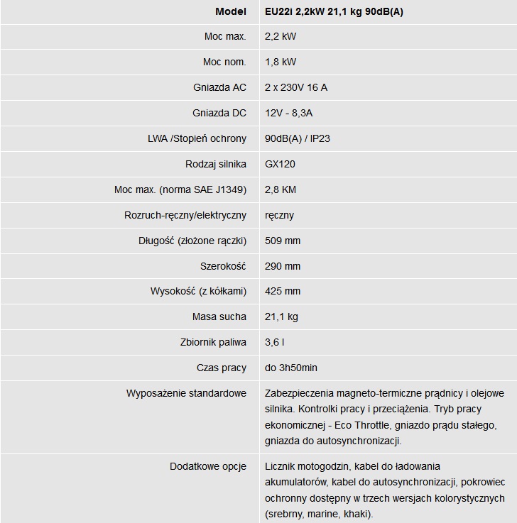 Bardzo cicho pracuje i posiada małą wagę w stosunku do generowanej mocy maksymalnej, wysoką jakość prądu wyjściowego (inwerterowa stabilizacja napięcia)oraz możliwość równoległego połączenia dwóch generatorów EU22i w celu podwojenia mocy wyjściowej (autosynchronizacja) EU 22i pracuje w ekonomicznym trybie (ECO) inteligentnie zmniejszającym zużycie paliwa, w zależności od wielkości obciążenia.