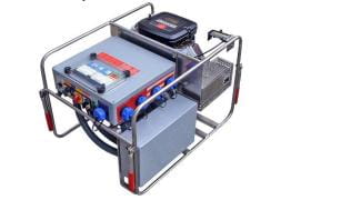 Spalinowy, przenośny agregat do połowu ryb prądem stałym (impulsowym ) zamontowany wraz z układem sterującym w zwartej stalowej ramie ze stali nierdzewnej z uchwytami do przenoszenia wraz z kompletnym wyposażeniem do pracy o następujących parametrach technicznych Napęd: 4-suwowy silnik benzynowy Briggs-Stratton Vanguard HP20kM Generator prądu trójfazowego 360Hz z magnesami trwałymi Moc: 13000 W Klasa ochronna: II – typ IP55 Parametry prądu wyjściowego Prąd stały Napięcie: 300/600V Moc wyjściowa: 13000W Prąd impulsowy Napięcie: 600V Częstotliwość: zakres 10-100 Hz Moc wyjściowa impulsu: maks. 160kW/impuls Panel kontrolny zawierający: 2 gniazda anodowe, 1 gniazdo do katody, 2 stopniową regulacja napięcia prądu stałego, gniazdo wyłącznika bezpieczeństwa, mierniki: woltomierz i amperomierz. W pełni izolowane wtyczki i kable przyłączeniowe, wtyczki bez zewnętrznych elementów z metalu Nożny wyłącznik bezpieczeństwa, Waga:101 kg